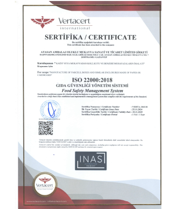 Yönetim SistemiGıda ile temas eden ambalajlarda hijyen, güvenlik ve kalite standartlarına uygun üretim yapıyoruz. ISO 22000:2018 sertifikamız, ambalajlarımızın gıda güvenliği açısından uluslararası normlara uygun olduğunu belgeliyor.
